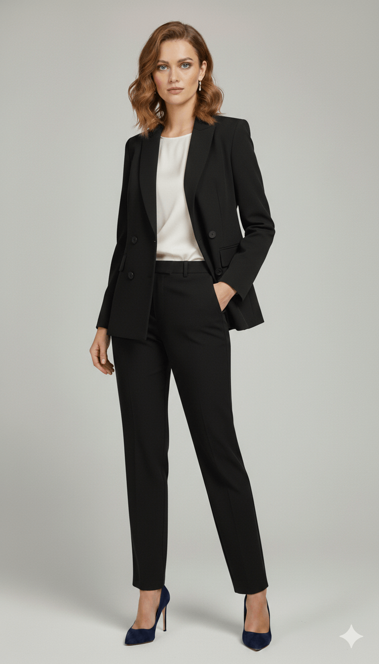 Tailleur dal design sartoriale e contemporaneo, pensato per una donna dinamica che ama uno stile deciso ma raffinato. La giacca doppiopetto, caratterizzata da rever classico e linea leggermente strutturata, valorizza la silhouette con un fit elegante e moderno. I pantaloni a gamba dritta completano il look con equilibrio e versatilità, rendendo il capo ideale sia per il contesto professionale che per occasioni più formali.